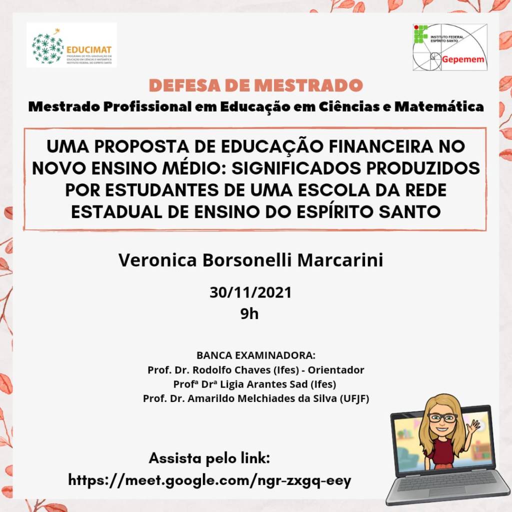 Informamos que a defesa de mestrado da aluna Veronica Borsonelli Marcarini ocorrerá no dia 30/11/2021, às 09h, com o título “Uma proposta de Educação Financeira no novo Ensino Médio: significados produzidos por estudantes de uma escola da rede estadual de ensino do Espírito Santo”. A aluna está vinculada ao Programa de Pós-Graduação em Educação em Ciências e Matemática (Educimat- Ifes).