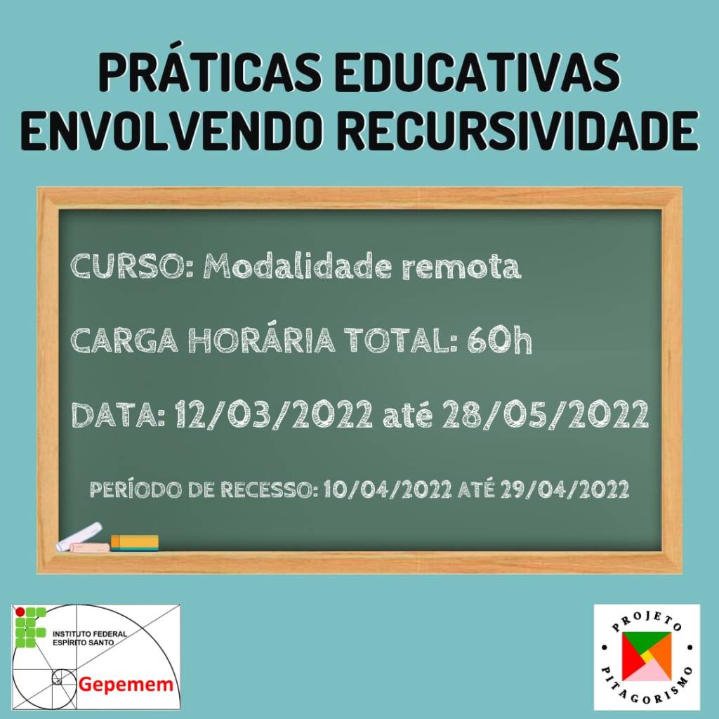 O Gepemem irá realizar o curso de formação continuada de “Práticas educativas investigativas envolvendo sequências e recursividade”, destinado a: Licenciandos em Matemática; Professores de Matemática do Ensino Fundamental e/ou Ensino Médio; Alunos de Programas de Pós-Graduação em Educação Matemática.