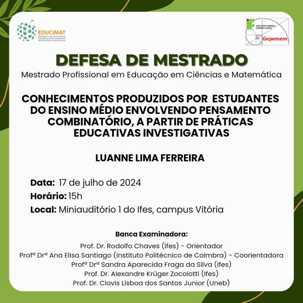 Informamos a defesa de Mestrado de Luanne Lima Ferreira que ocorrerá no dia 17/07/2024, às 15h, com o título “Conhecimentos produzidos por estudantes de ensino médio envolvendo pensamento combinatório, a partir de práticas educativas investigativas”, presencialmente no miniauditório 1 do Ifes – campus Vitória. A gepeminiana está vinculada ao Programa de Pós-Graduação em Educação em Ciências e Matemática (Educimat- Ifes).