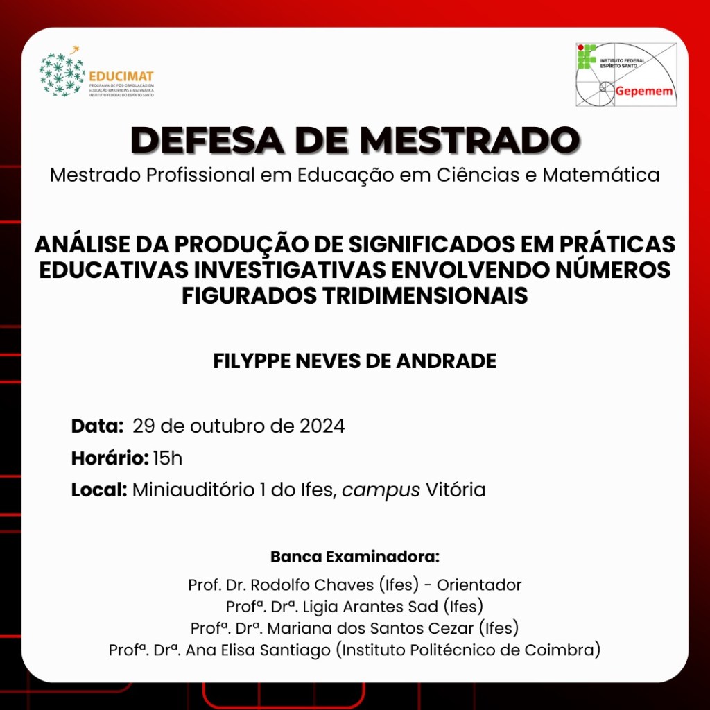 Informamos que a defesa de Mestrado do aluno Filyppe Neves de Andrade ocorrerá no dia 29/10/2024, às 15h, com o título “Análise da produção de significados em práticas educativas investigativas envolvendo números figurados trimendisionais”, presencialmente no miniauditório 1 do Ifes – Campus Vitória. O aluno está vinculado ao Programa de Pós-Graduação em Educação em Ciências e Matemática (Educimat- Ifes).