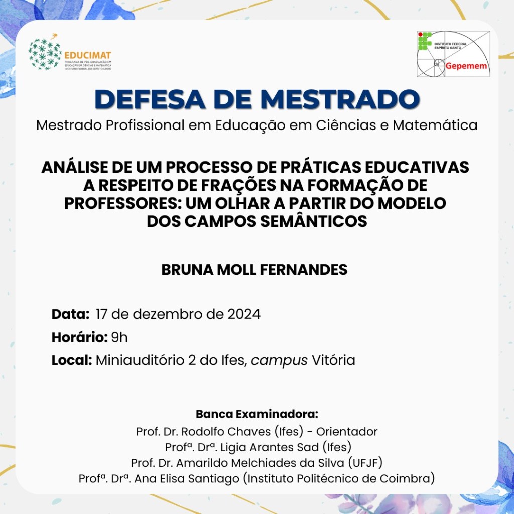 Informamos que a defesa de Mestrado da aluna Bruna Moll Fernandes ocorrerá no dia 17/12/2024, às 9h, com o título “Análise de um processo de práticas educativas a respeito de frações na formação de professores: um olhar a partir do Modelo dos Campos Semânticos”, presencialmente no miniauditório 2 do Ifes – Campus Vitória. A aluna está vinculada ao Programa de Pós-Graduação em Educação em Ciências e Matemática (Educimat- Ifes).